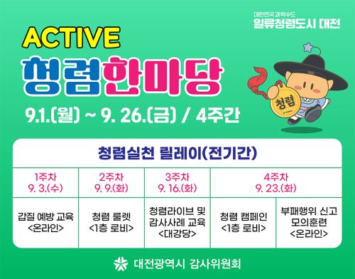 [아이뉴스24 강일 기자] 대전시는 다가오는 추석 명절을 맞아 9월 1일부터 26일까지 한 달간 전 직원을 대상으로 ‘ACTIVE 청렴한마당’을 진행한다. 청렴한마당은 전 공직자에게 청렴 의식을 전파하고, 조직 내 반부패·청렴 문화를 확산하기 위해 추진됐다.