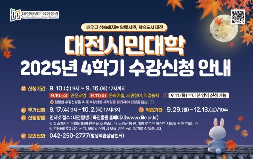 [아이뉴스24 강일 기자] 대전평생교육진흥원은 대전시민대학의 2025년도 4학기 평생학습 프로그램 수강생을 10일 오전 9시부터 16일 오후 5시까지 선착순 모집한다.