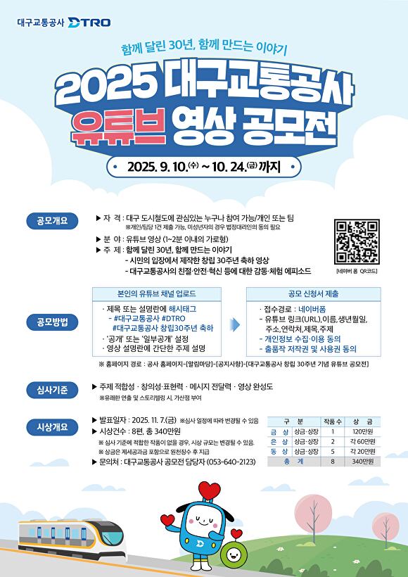 영상은 1~2분 이내의 가로형으로 제작해 개인 유튜브 채널에 업로드한 뒤, ‘#대구교통공사’, ‘#DTRO’, ‘#대구교통공사창립30주년축하’ 해시태그를 포함해야 하며, 네이버폼을 통해 접수할 수 있다. 접수 링크는 공사 홈페이지와 SNS, 도시철도 역사 내 안내 포스터 및 배너를 통해 확인 가능하다.
