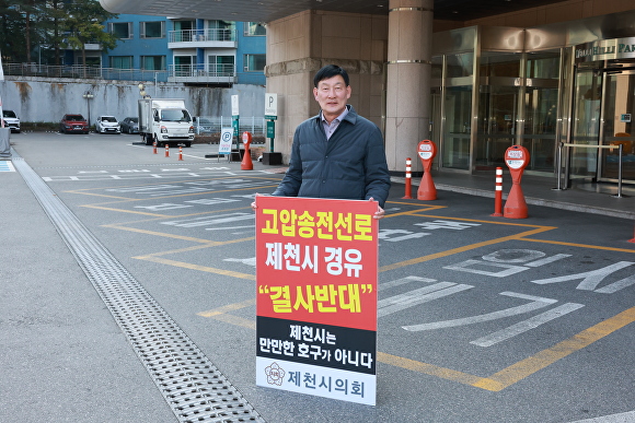 [아이뉴스24 이용민 기자] 박영기 충북 제천시의회 의장이 29일 산업통상자원부와 한국전력공사가 추진 중인 ‘신평창~신원주 송전선로 건설사업’ 입지선정위원회 회의 현장 앞에서 ‘송전선로 제천경유 결사반대’ 1인 시위를 벌였다.