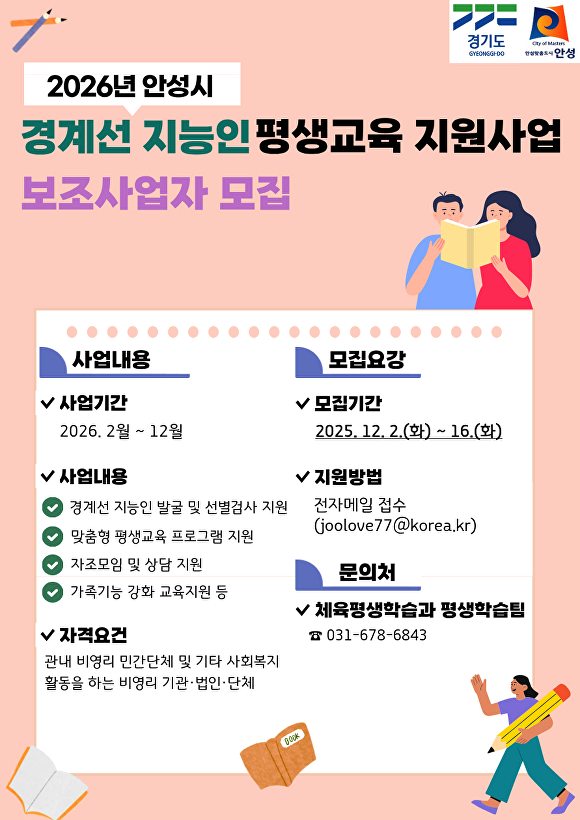 [아이뉴스24 임정규 기자] 경기도 안성시는 관내 경계선 지능인의 체계적인 진단과 학습 지원을 위해 '2026년 경계선 지능인 평생교육 지원사업'을 수행할 보조사업자를 오는 16일까지 공개 모집한다고 2일 밝혔다.