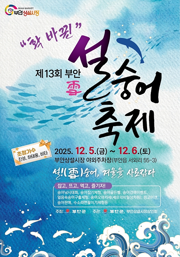 김형호 부안상설시장 상인회장은 “제13회 부안설숭어 축제를 통해 시장에 활력이 돌아오고, 군민과 관광객 모두가 따뜻한 겨울의 추억을 쌓는 계기가 되길 바란다.”며 “많은 분들의 방문과 참여를 부탁드린다”고 말했다.
