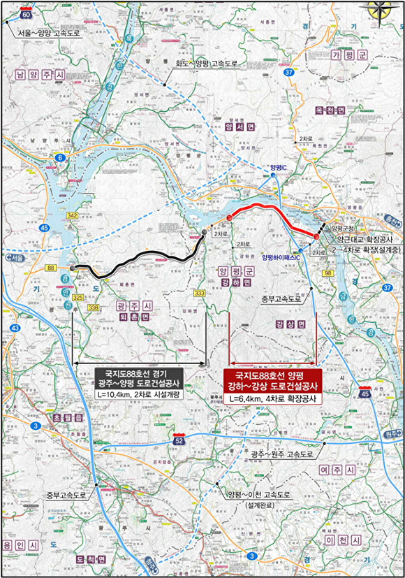 '국지도 98호선 양근대교 확장공사'는 양평군 강상면 병산리에서 양평읍 양근리를 잇는 기존 양근대교의 하류에 2차로 교량을 신설해 4차로로 활용하는 내용이다.