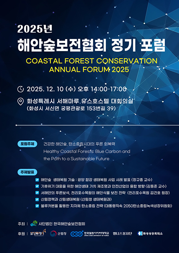 [아이뉴스24 이윤 기자] 탄소중립 시대의 정책 논의가 다시 해안으로 향하고 있다. 사단법인 한국해안숲보전협회는 오는 10일 오후 2시 화성특례시 서해마루 유스호스텔 대회의실에서 ‘2025년 해안숲보전협회 정기 포럼’을 개최한다.