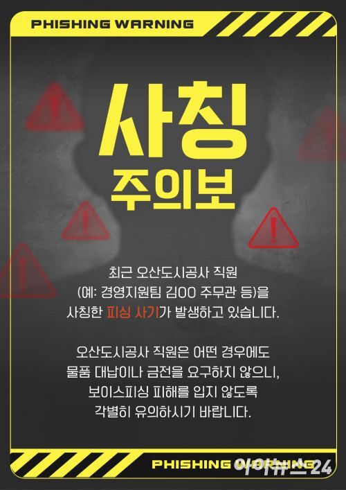 오산도시공사는 “공사는 어떤 경우에도 선입금·대금 선납, 중간 업체를 통한 대리 구매 지시, 계약 체결 전 납품 요청, 주거래은행 사칭 미팅 요구 등을 하지 않는다”며 “직원 실명을 도용한 전화나 문자로 선입금을 요구하는 모든 행위는 사기로, 의심스러운 연락이나 위조 문서가 확인될 경우에는 즉시 사실 여부를 공사에 문의해 달라”고 말했다.