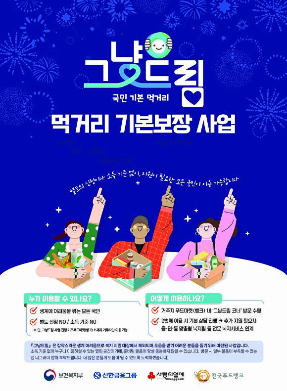 ‘그냥드림’ 시범사업은 경제적 어려움으로 끼니 해결이 어려운 주민들에게 별도의 소득 기준 없이 식품을 제공하고, 복지상담을 통해 필요한 서비스를 연계함으로써 위기가구를 선제적으로 발굴·지원하기 위한 사업이다.
