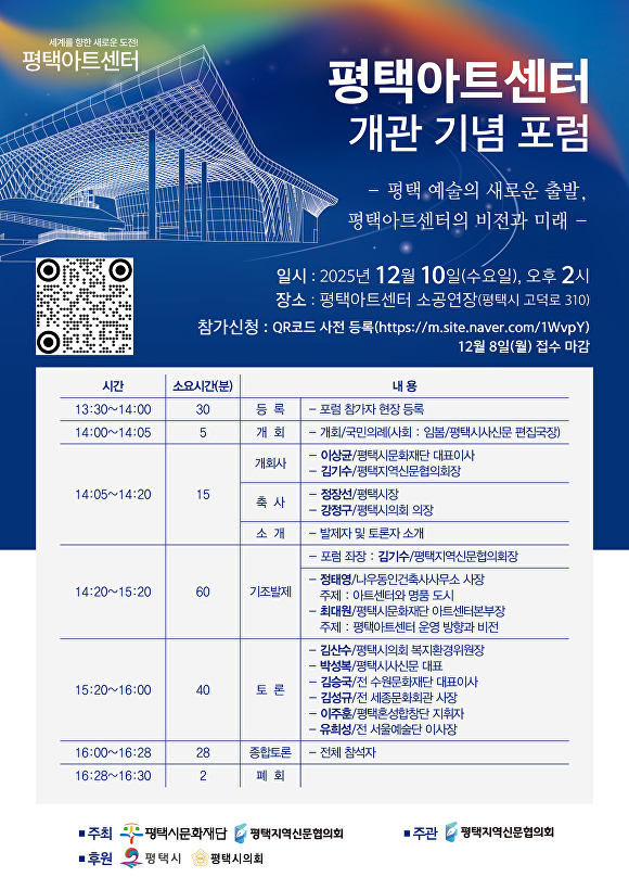 이어지는 종합토론에는 김산수 평택시의회 복지환경위원장, 박성복 평택시사신문 대표, 김승국 전 수원문화재단 대표이사, 김성규 전 세종문화회관 사장 등 문화예술 분야 전문가들이 참여해 국내 아트센터의 운영 과제와 시민 중심의 미래 방향성을 논의한다.