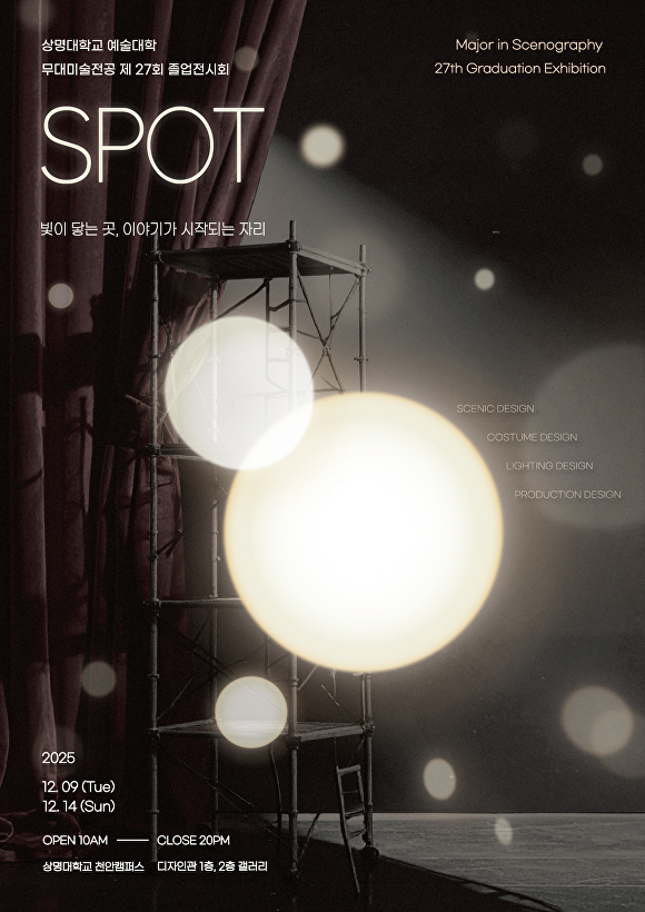 [아이뉴스24 박준표 기자] 상명대학교 무대미술전공 학생들이 9일부터 14일까지 6일간 상명대 디자인관 상명갤러리에서 제27회 졸업작품전 ‘SPOT: 빛이 닿는 곳, 이야기가 시작되는 자리’를 연다.