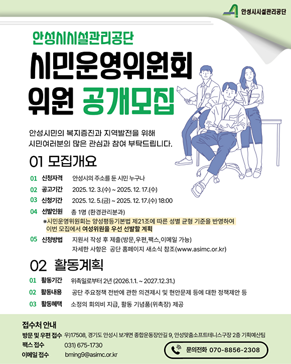 [아이뉴스24 임정규 기자] 경기도 안성시시설관리공단은 오는 17일까지 시민운영위원회 환경관리분과 위원 1명을 공개 모집한다.