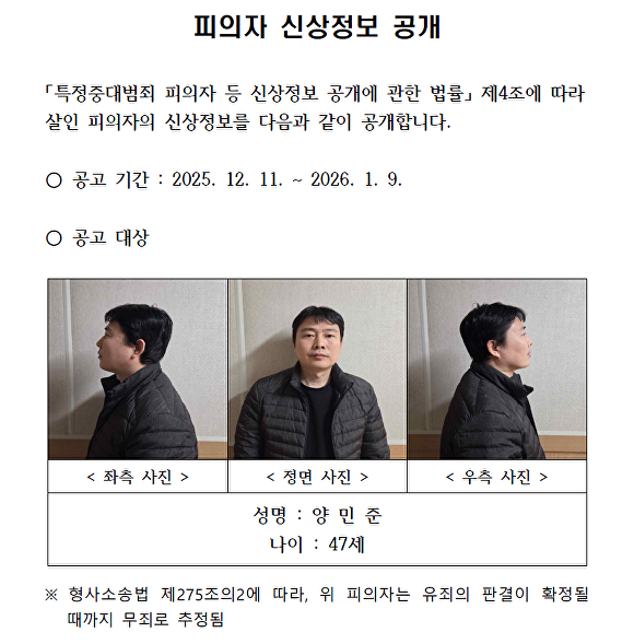 특정 중대범죄 피의자 신상정보 공개에 관한 법률에 따라 피의자가 이의를 제기하면 5일간 유예기간을 두지만 양씨는 별도 이의를 제기하지 않아 이날 바로 공개됐다.