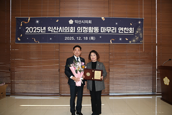 강 부의장은 지난 18일 웨스턴라이프호텔에서 열린 ‘2025년 익산시의회 의정활동 마무리 연찬회’에서 대한민국시군자치구의회의장협의회 김현기 회장을 대신해 김경진 의장으로부터 상패를 수여받았다.