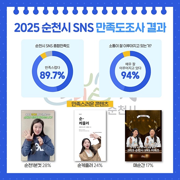 시 관계자는 “이번 만족도 조사에서 제시된 시민 의견을 적극 반영해 더 빠르고, 더 정확하고, 더 친근한 순천시 SNS 채널로 발전시켜 나가겠다”고 전했다.