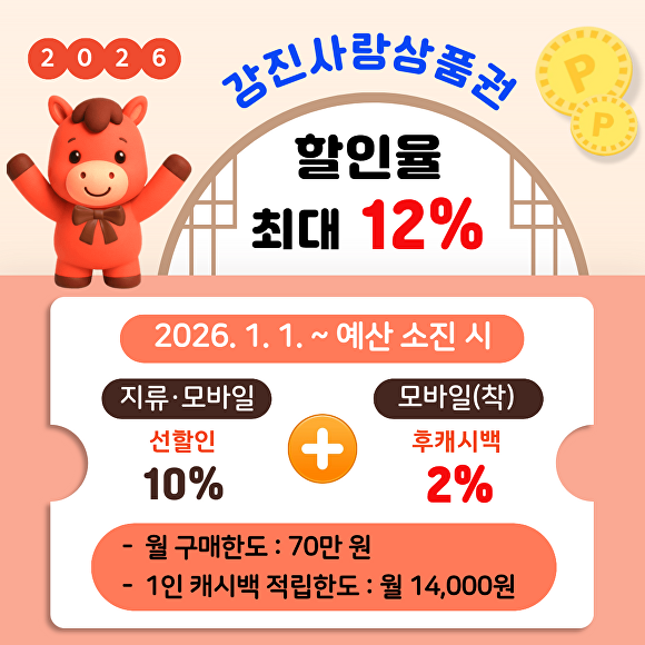 [아이뉴스24 김상진 기자] 전남 강진군이 내년 적토마의 해를 맞아 지역경제 활성화와 군민 소비 부담 완화를 위해 지역사랑상품권 할인율을 상향 운영한다고 30일 밝혔다.