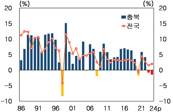 2009년 이후 충북경제가 전국보다 높은 수준의 성장세를 유지한 점을 고려할 때 최근의 2년 연속 마이너스(-) 성장은 이례적이다.
