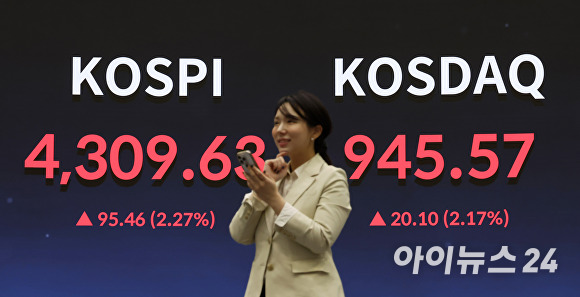 한국거래소에 따르면 이날 코스피는 전 거래일보다 2.27% 오른 4309.63에 거래를 마쳤다. 사상 첫 4300선 돌파다.