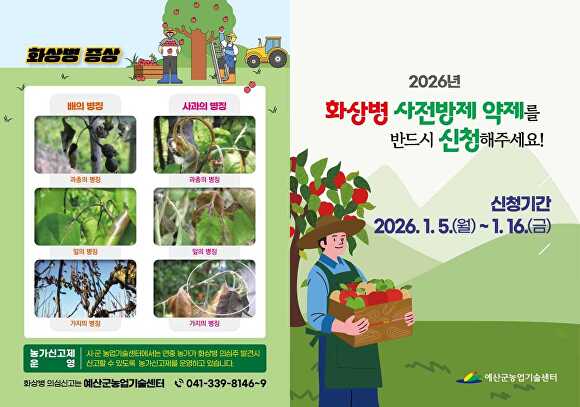 예산군농업기술센터는 식물방역법상 법정 금지병해인 과수화상병의 사전 예방을 위해 5일부터 16일까지 관내 사과·배 재배 농가를 대상으로 사전방제 약제 신청을 받는다고 밝혔다. 신청 농가에는 약제를 무상으로 지원한다.