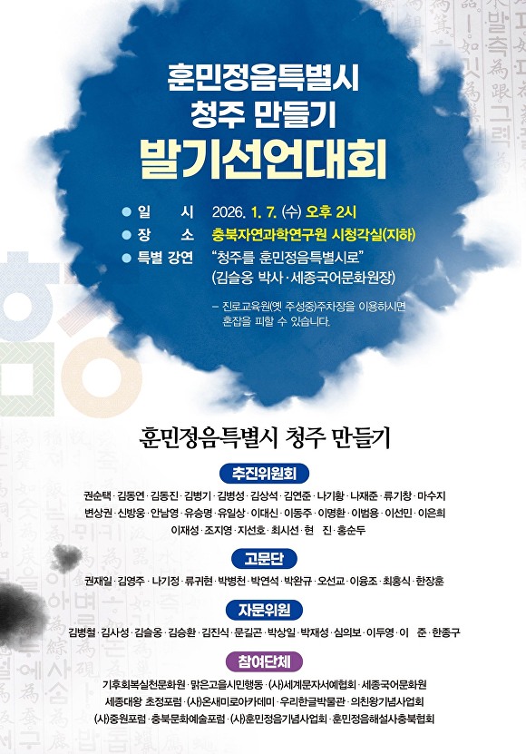 앞서 청주시의회(의장 김현기)는 청주가 훈민정음 창제(1434년)에 유서가 있는 지역이라는 역사적 사실을 알리고, 훈민정음의 역사·문화적 가치를 체계적으로 보존하고 진흥하기 위해 국민의힘 이상조 의원 주도로 지난해 ‘청주시 훈민정음의 가치 보존 및 진흥에 관한 조례’를 만들었다.