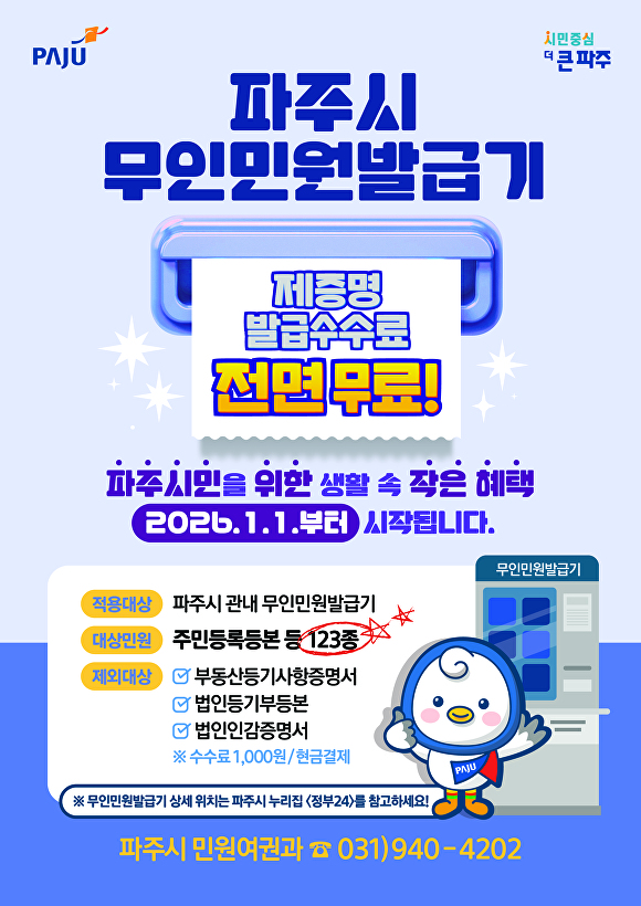 파주시 관계자는 “이번 무인민원발급기 수수료 전면 무료화는 금액으로는 크지 않지만, 시민들이 일상에서 자주 체감할 수 있는 ‘생활 속 작은 혜택’”이라며 “앞으로도 시민의 일상을 세심하게 살피며 생활밀착형 행정서비스를 계속 추진해 나가겠다”고 밝혔다.