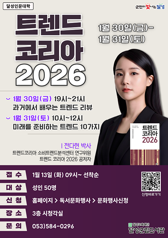 각 강연은 선착순 50명을 모집하며 참가비는 무료다. 신청은 강연일 기준 2주 전 화요일 오전 9시부터 달성군립도서관 누리집을 통해 가능하다.