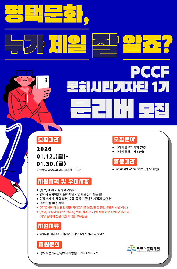 [아이뉴스24 임정규 기자] 평택시문화재단은 재단의 문화예술 사업과 지역 문화 현장을 시민의 시각으로 기록할 제1기 문화시민기자단 ‘문리버’를 오는 30일까지 모집한다고 14일 밝혔다.