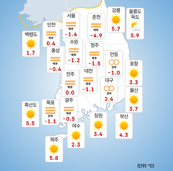 부산지방기상청에 따르면 이날 오전 9시 현재 주요 지역의 기온은 부산 4.3도, 울산 3.7도, 창원 3.4도로 기록됐다.