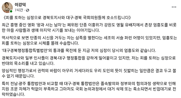그는 최근 흥행 중인 영화 왕과 사는 남자를 언급하며 단종의 시신을 거둔 엄흥도의 결단에 빗대어 "저의 심정이 당시와 같다"며 통합법안에 대한 반대 입장을 분명히 했다.