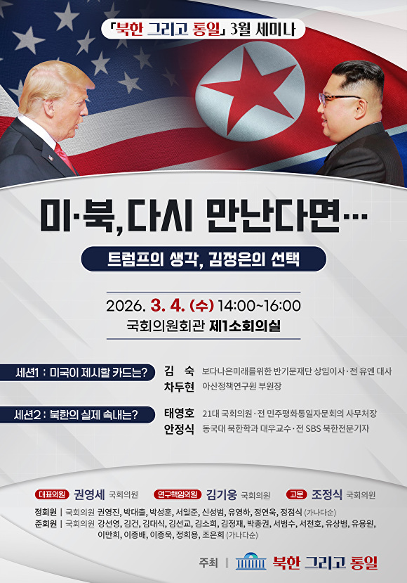 [아이뉴스24 이창재 기자] 김기웅 국민의힘 국회의원(대구 중남구)은 국회 '북한 그리고 통일' 의원 포럼을 오는 3월 4일 국회의원회관 제1소회의실에서 ‘미·북, 다시 만난다면…트럼프의 생각, 김정은의 선택’을 주제로 세미나를 개최한다고 23일 밝혔다.