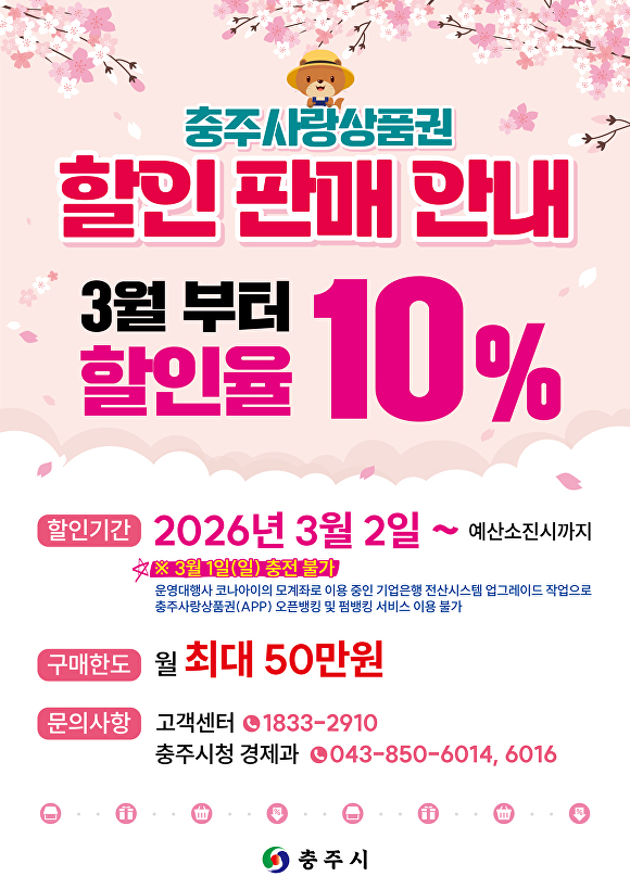 [아이뉴스24 소진섭 기자] 충북 충주시는 오는 3월 2일부터 충주사랑상품권 할인율을 10%로 유지하고, 월 구매한도는 70만원에서 50만원으로 조정한다고 23일 밝혔다.