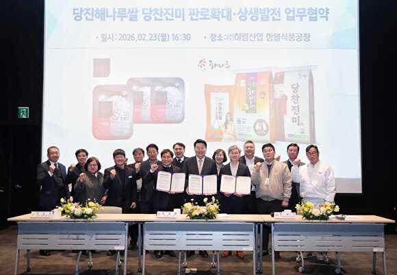 충남 당진시는 ㈜하림산업·당진해나루쌀조합공동사업법인과 당진쌀 사용 확대를 위한 업무협약을 체결했다고 24일 밝혔다. 협약식은 전날 익산 하림산업 함열식품공장에서 열렸다.