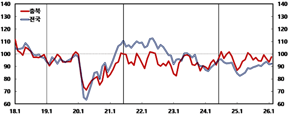 25일 한국은행 충북본부가 발표한 ‘2026년 2월 충북지역 기업경기조사 결과’ 자료에 따르면 2월중 비제조업 기업심리지수(CBSI)는 97.6으로 전월에 비해 4.0p 상승했다.
