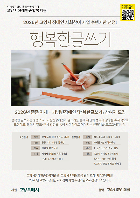 [아이뉴스24 김재환 기자] 경기도 고양시는 고양시장애인종합복지관이 2026년 고양시 장애인 사회참여 사업 수행기관으로 선정됐다.