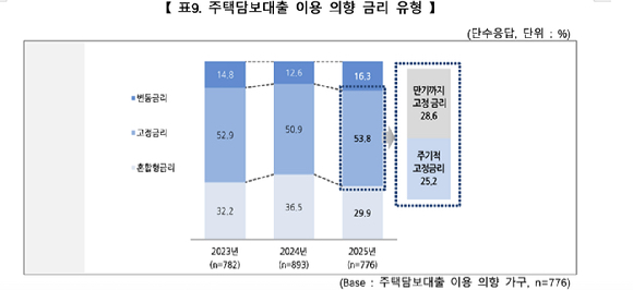 한국주택금융공사는 26일 전문조사기관과 함께 한 '2025년 주택금융 및 보금자리론 실태조사'에 따르면 주담대 이용을 희망하는 가구 중 고정금리를 선호하는 비중은 53.8%로 전년(50.9%) 대비 2.9%포인트(p) 증가했다.