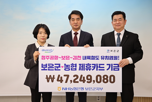 송재철 농협은행 보은군지부장은 “보은군 제휴카드에서 발생한 적립금이 지역 발전에 의미 있게 사용되길 바란다”며 “앞으로도 지역과 상생하는 금융기관 역할에 힘쓰겠다”고 말했다.