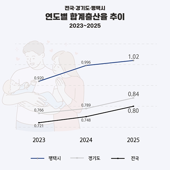 26일 평택시에 따르면 국가데이터처가 발표한 '2025년 잠정 합계출산율' 집계 결과, 평택시의 합계출산율은 지난 2024년 0.996명에서 지난해 1.02명으로 상승했다.