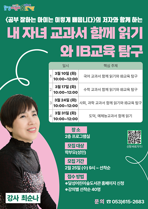 [아이뉴스24 이창재 기자] 대구 달성군 달성어린이숲도서관이 학부모를 대상으로 한 부모교육 특강 ‘내 자녀 교과서 함께 읽기와 IB교육 탐구’ 참여자를 선착순 모집하고 있다고 26일 밝혔다.