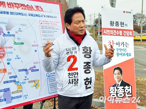 국민의힘 황종헌 천안시장 예비후보는 26일 종축장 부지 앞에서 시민 의견 수렴 간담회를 열고 “127만 평 규모 부지에는 순수 산업단지만 배치하고 배후 도시는 2㎞ 떨어진 곳에 조성하는 것이 바람직하다”고 밝혔다. 산업 폐기물 시설 역시 별도 부지에 설치해 광역 연계 처리하는 방안을 제시했다.
