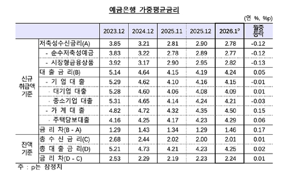 정기예금금리 전월대비 0.12%p↓…예대금리차 상승 전환