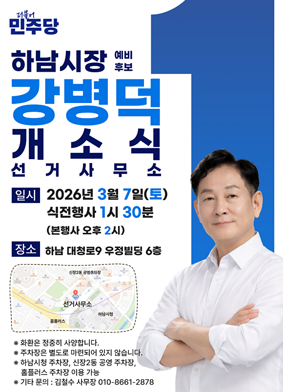 [아이뉴스24 정재수 기자] 강병덕 더불어민주당 하남시장 예비후보가 다음 달 7일 선거사무소 개소식을 열고 본격적인 선거 행보에 나선다.