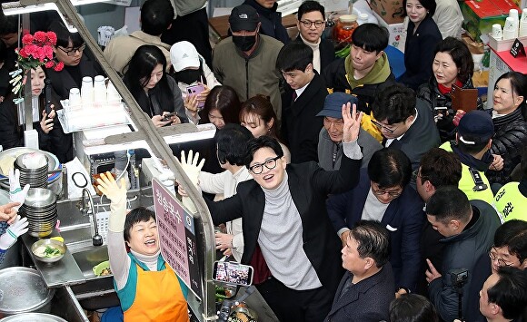 시장 입구부터 “한동훈 파이팅”, “응원합니다” 등의 손피켓을 든 인파가 길게 늘어서며 사실상 선거 유세장을 방불케 하는 장면이 연출됐다. 경찰 비공식 추산 1천여 명, 현장 체감으로는 그 이상이 운집한 것으로 전해졌다.