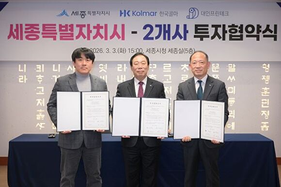 [아이뉴스24 강일 기자] 세종시는 3일 시청 세종실에서 한국콜마㈜, ㈜대인프린테크와 관내 산업단지 내 공장 신설 및 전면 이전을 위한 1858억원 규모의 투자협약(MOU)을 체결했다.