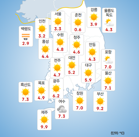 부산지방기상청에 따르면 이날 오전 9시 현재 주요 지역의 기온은 부산 9.2도, 울산 7.1도, 창원 7도로 기록됐다.