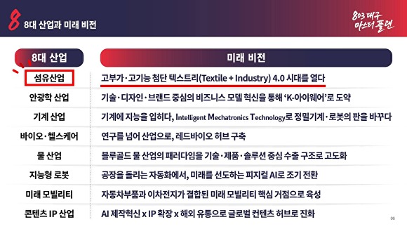 ‘803 대구 마스터플랜’은 섬유를 비롯해 안광학, 기계, 바이오·헬스, 물, 지능형 로봇, 미래 모빌리티, 콘텐츠 IP 등 8대 전략산업을 중심으로 대구 산업 구조를 재편하는 구상이다.