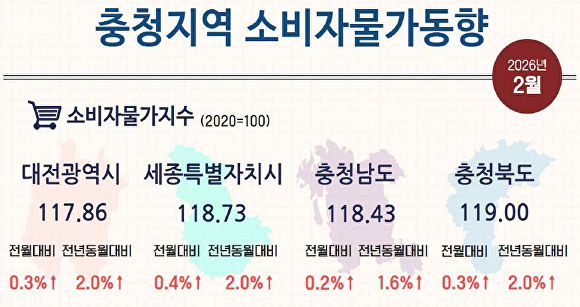 6일 충청지방데이터청에 따르면, 2월 충북지역 소비자물가지수는 119.00(2020년=100)로 전월대비 0.3%, 전년동월대비 2.0% 각각 상승했다.