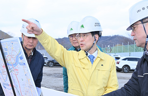김정기 대구시장 권한대행이 북구 조야동에 위치한 ‘조야~동명 광역도로 건설사업’ 현장을 점검하고 있다 [사진=대구시]