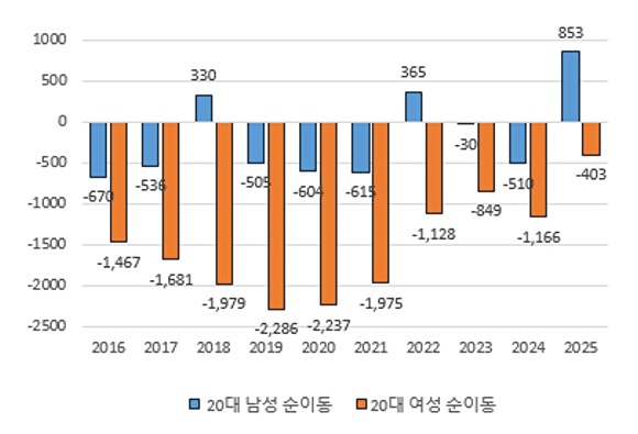 다만 20대 여성의 순유출 규모는 빠르게 줄어들고 있다. 2020년 2237명에서 5년만인 지난해에는 403명까지 감소했다.