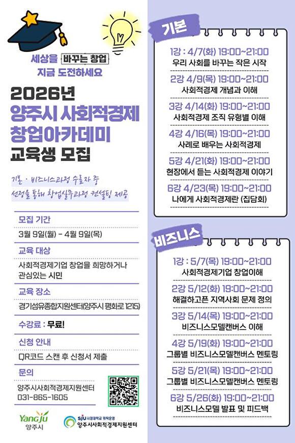 모집 인원은 기본과정 40명, 비즈니스 과정 30명으로 선착순 마감된다. 수강료는 전액 무료이며, 참여 희망자는 양주시사회적경제지원센터 누리집 공지사항을 참고해 신청서 링크나 정보무늬(QR)코드를 통해 접수하면 된다.