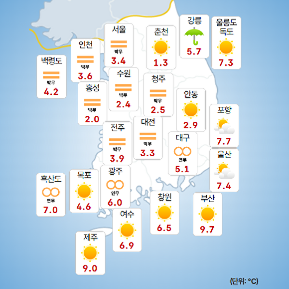 부산지방기상청에 따르면 이날 오전 9시 현재 주요 지역의 기온은 부산 9.7도, 울산 7.4도, 창원 6.5도로 기록됐다.