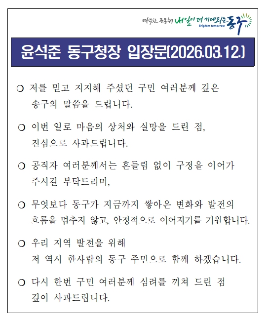 지역 사회에서는 윤 구청장의 갑작스러운 퇴장에 대한 아쉬움의 목소리도 나오고 있다. 일부 구민들은 “동구 발전을 위해 노력해 온 부분이 있었는데 임기를 다 채우지 못해 안타깝다”는 반응을 보였다.