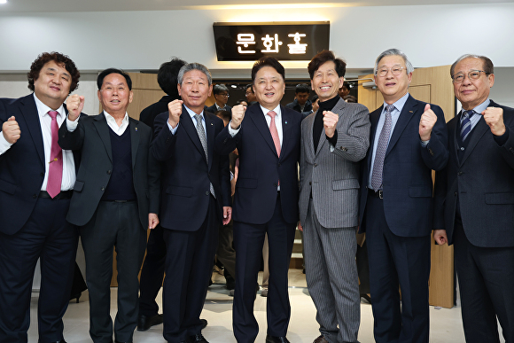 13일 충북도청 문화홀 개관식에서 김영환(가운데) 도지사 등 참석자들이 기념 사진을 찍고 있다. [사진=충북도]
