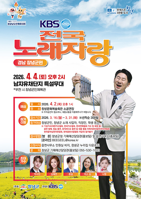 창녕군은 내달 4일 오후 2시 남지유채단지 특설무대에서 대한민국 대표 국민 참여 프로그램 ‘전국노래자랑 창녕군편’을 개최한다고 16일 밝혔다.